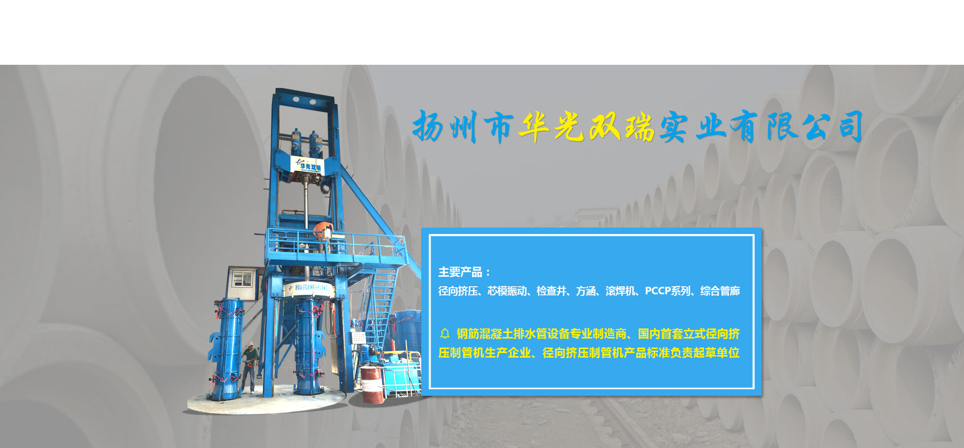 ????????揚(yáng)州市華光雙瑞實(shí)業(yè)有限公司,位于中國(guó)歷史文化名城揚(yáng)州市東郊江都區(qū)丁伙工業(yè)園區(qū),公司成立于2000年10月,是一家專門致力于鋼筋混凝土排水管生產(chǎn)裝備的設(shè)計(jì)開發(fā)、加工制造、銷售服務(wù)的專業(yè)制造商。公司2016年度被授予全國(guó)建材機(jī)械產(chǎn)品定點(diǎn)生產(chǎn)企業(yè),2017年度被授予中國(guó)混凝土與水泥制品協(xié)會(huì)會(huì)員單位,江蘇省認(rèn)定企業(yè)技術(shù)中心,江蘇省研究生工作站,揚(yáng)州市水泥制品工程技術(shù)研究中心,先后承擔(dān)過國(guó)家火炬計(jì)劃項(xiàng)目一項(xiàng),省科技項(xiàng)目二項(xiàng),揚(yáng)州市重點(diǎn)研發(fā)項(xiàng)目一項(xiàng)。公司擁有自主知識(shí)產(chǎn)權(quán)36項(xiàng)(發(fā)明專利6項(xiàng),實(shí)用新型專利30項(xiàng)),公司研發(fā)的13種產(chǎn)品榮獲江蘇省高新技術(shù)產(chǎn)品稱號(hào)。公司產(chǎn)品有立式徑向擠壓制管機(jī)系列、芯模振動(dòng)制管機(jī)系列、檢查井系列、方涵系列、自動(dòng)變徑滾焊機(jī)系列、PCCP系列、綜合管廊系列。核心產(chǎn)品立式徑向擠壓機(jī)2014年度榮獲混凝土與水泥制品行業(yè)技術(shù)革新一等獎(jiǎng),2015年度獲江蘇省機(jī)械工業(yè)科技進(jìn)步二等獎(jiǎng),2016年度獲全國(guó)建材行業(yè)技術(shù)革新一等獎(jiǎng),預(yù)制混凝土檢查井生產(chǎn)線榮獲混凝土與水泥制品行業(yè)2017年度技術(shù)革新二等獎(jiǎng),2011年度立式水泥制管成型機(jī)獲混凝土與水泥制品行業(yè)技術(shù)革新三等獎(jiǎng)。公司還是國(guó)內(nèi)首套立式徑向擠壓制管機(jī)的生產(chǎn)企業(yè),該產(chǎn)品2012年起填補(bǔ)了國(guó)內(nèi)同類產(chǎn)品的空白,公司2013年被國(guó)家建筑材料工業(yè)機(jī)械標(biāo)準(zhǔn)技術(shù)委員會(huì)批準(zhǔn)為《鋼筋混凝土排水管 芯模振動(dòng)制管機(jī)》《水泥制品用鋼筋混凝土管排水管鋼筋骨架滾焊機(jī)》的行業(yè)標(biāo)準(zhǔn)制定單位,2017年11月被國(guó)家建筑材料工業(yè)機(jī)械標(biāo)準(zhǔn)技術(shù)委員會(huì)批...